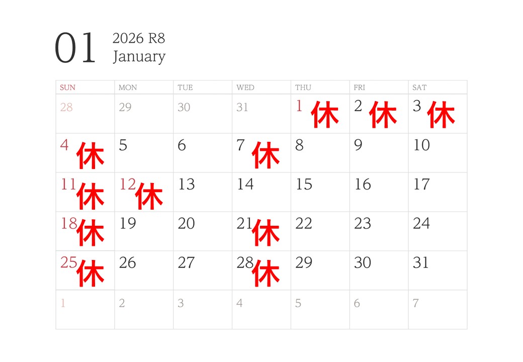 今月は1/12(月)が祝日でお休み、1/14(水)が1日診療となります!